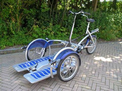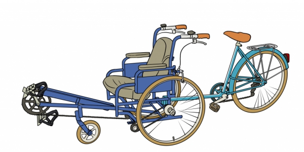 Plus qu'un fauteuil roulant relié à un vélo pour de grandes balades familiales, ce "fauteuil-tandem" a l'originalité d'être muni d'un pédalier et de permettre à la personne assise de ne pas toujours rester passive.