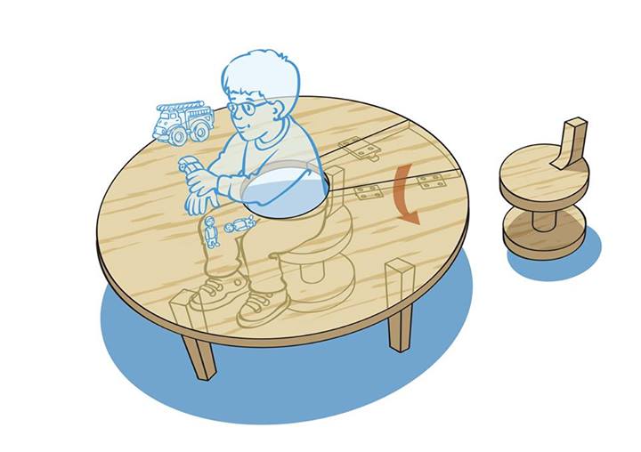 Afin que Mathieu et sa sœur puissent jouer en toute sécurité, leur maman a imaginé une table de jeu sécurisée ronde avec une ouverture au centre qui permet à Mathieu d’être installé sur un tabouret tournant.
