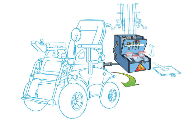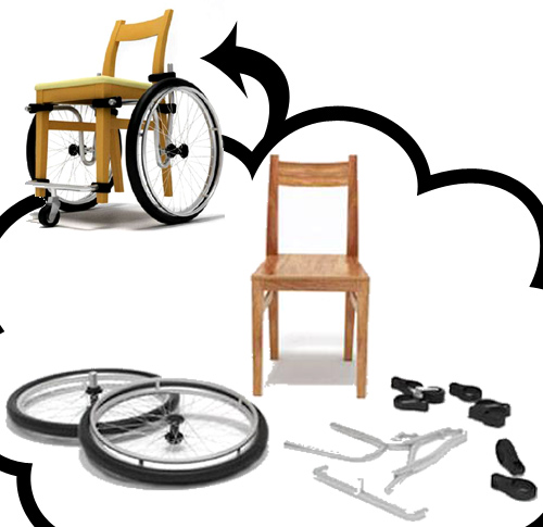 le fauteuil pourrait s'intercaler et ce faisant, se transformer en véhicule urbain léger, permettrait de transporter des objets volumineux
