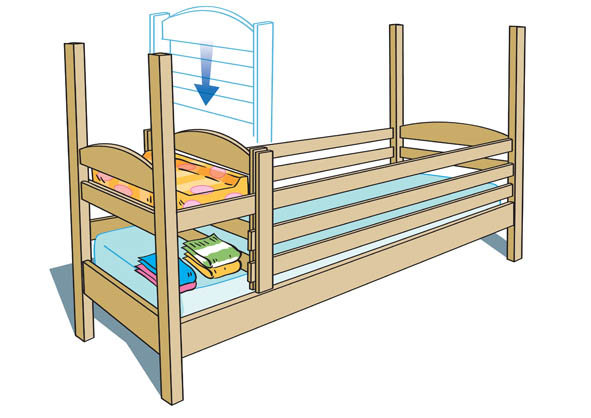 Réalisé par Mme Mullié, un lit double à partir d’un lit superposé auquel on ajoute une partie table à langer et un espace de rangement en dessous.
