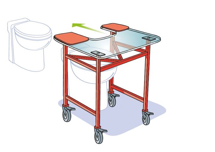 L'adaptateur est un véritable siège composé d'un dossier et de planches latérales sur lesquelles est apposable un cadre mousse en plastique avec des ceintures. Le repose pied est réglable selon la taille de l'usager. Grâce à ses 4 roulettes, l'adaptateur se place par dessus des WC standards.