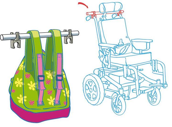 Afin de pouvoir transporter son sac à dos sans avoir à fournir d'effort, le papa de Clarisse a mis en place une barre de PVC qui se clipse et dé-clipse à volonté sur les poignées du fauteuil de sa fille. Simple, mais efficace !