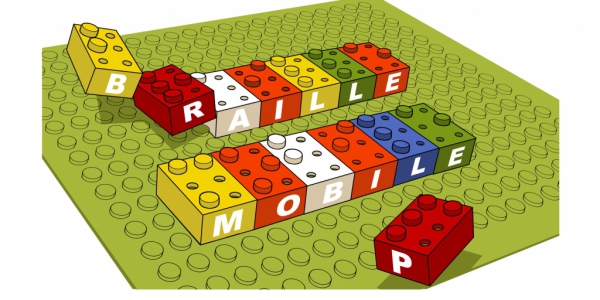 Jeu d'apprentissage de l'alphabet Braille à partir de petites briques en plastique encastrables à six points, issues d'un jeu de construction bien connu du commerce.