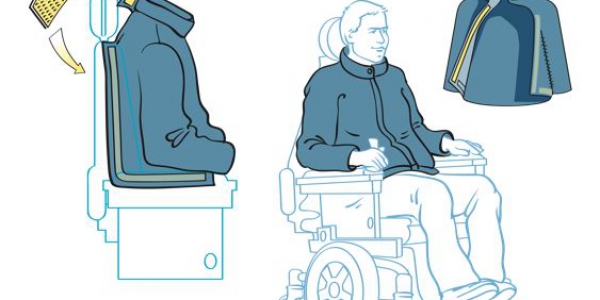 La maman de Wilfried a transformé l'un de ses blousons, raccourci, la partie dorsale découpée selon la forme du dossier du fauteuil et la couture intérieure des manches décousue.