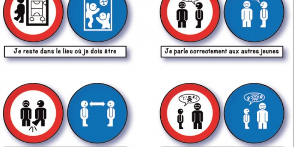 Pour rendre la vie plus harmonieuse au sein d'une Institut Médico-Éducatif, une équipe d'éducatrices a imaginé un code de bonne conduite composé de pictogrammes, des panneaux circulaires rouge et blanc pour les interdits et des panneaux circulaires bleus pour la bonne attitude.