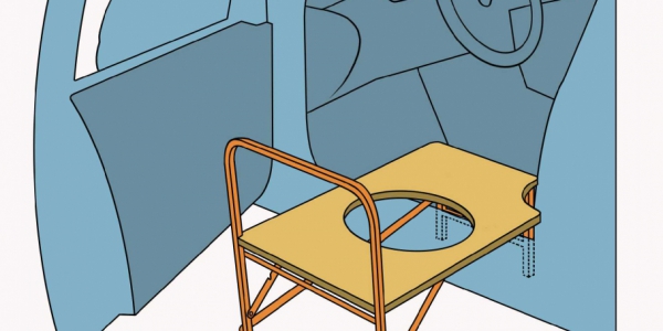 Dissimulée derriére la portière, un seau glissé sous la planche, la personne handicapée retrouve les moyens de palier à toute éventalité lors de grands trajets en automobile.