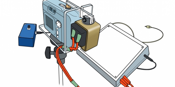 L'appareil est posé sur un pied muni de rotule et réglable en hauteur. Une équerre en plastique vissée sur le pied sert de support à l'appareil photo. L'autre extrémité du pied photographique est fixée à la tablette du fauteuil.