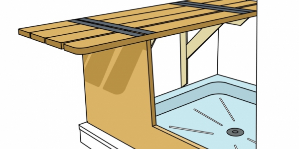 À défaut, Régis a eu l'idée de fabriquer un banc qui dépasse de 20 cm l'aplomb du bac de douche, ce qui lui permet de se transférer facilement.