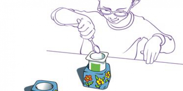 Lou Ann a des difficultés pour attraper les objets. Alors, pour qu'elle puisse manger toute seule son yaourt, Noël et Marie-Thérèse ont imaginé un porte yaourt directement coupé le fond d'un cache pot de fleurs.