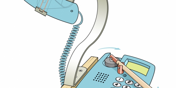 Son papa lui a adapté un téléphone classique de sorte que le combiné soit en permanence en position d'écoute posé sur un support en aluminium.