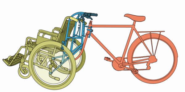Relier un VTT et un fauteuil roulant par un système d'axes démontables qui relierait les deux cadres…
