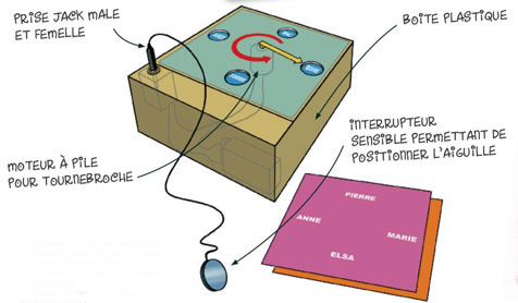 Jacky, psychologue dans une maison d'accueil spécialisée, a conçu ce dispositif grâce auquel certains résidents peuvent se positionner, donner des réponses non verbales à des questions posées par le personnel en appuyant sur un interrupteur très sensible et positionnant l'aiguille sur un pictogramme parmi plusieurs dessinés sur un support en carton.