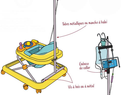 Solène est alimentée en continu après une longue hospitalisation. Pour permettre à sa fille de se déplacer malgré les contraintes liées aux perfusions, Vincent Tricoche a fabriqué une potence médicale à fixer sur le youpala à partir des tubes métalliques d'un ancien portant à vêtements, assemblés en forme de T et d'un crochet.