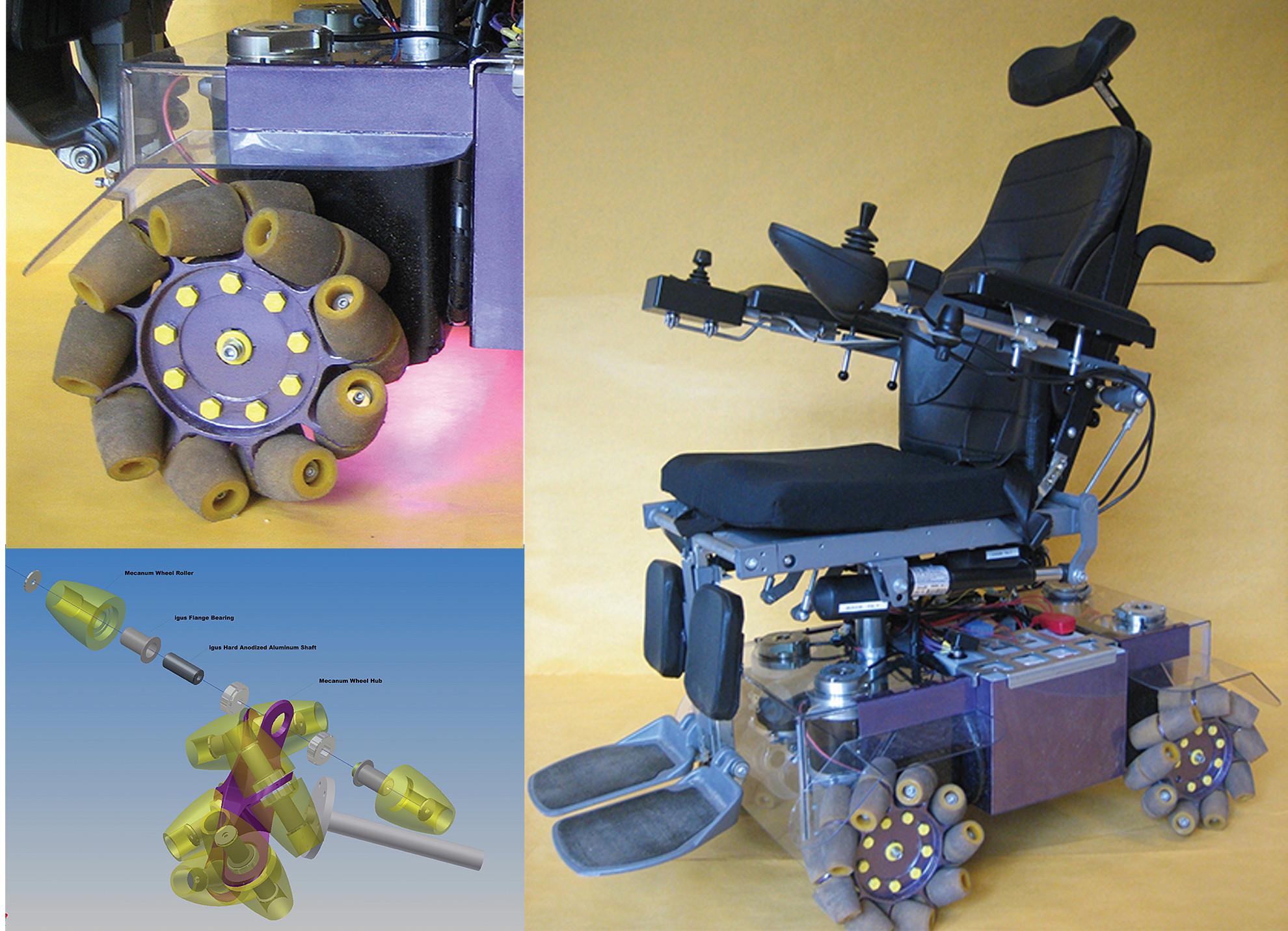 Basé sur ce principe technique, avec des roues composées de 72 cylindres en polyuréthanne disposés à 45 degrés, voici le fauteuil roulant omnidirectionnel imaginé par l'InvenTeam des étudiants du Upper Darby High School, Pennsylvania