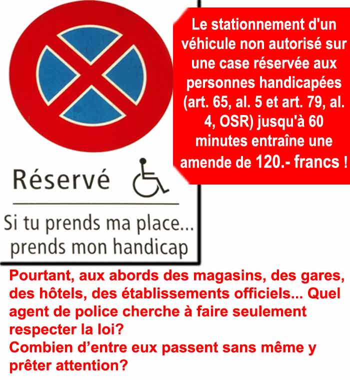 Les places de stationnement réservées sont régulièrement et outrageusement occupées par des personnes sans autorisation sans qu'aucune autorité ne vieille à les condamner pour ces faits. La police est très souvent tolérante pour ce délit jugé "mineur", si souvent que ce délit est devenu coutumier voire normal pour beaucoup de gens peu recommandables. Outre des bandits ou malfrats de tout poil, des policiers eux-mêmes, des politiciens, des fonctionnaires ou des livreurs usurpent régulièrement des places pourtant normalement réservées aux besoins des seules personnes handicapées.