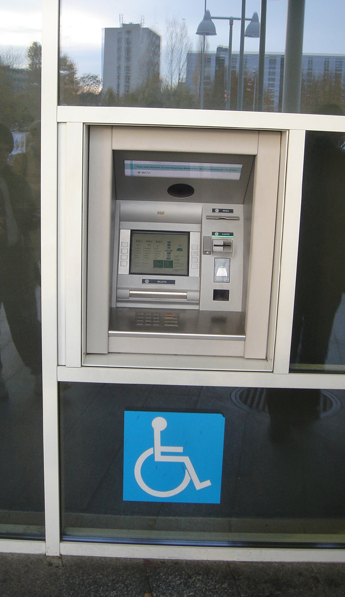 Au premier étage, on trouve également deux distributeurs bancomat dont celui de la BCV est accessible mais celui de la Poste ne l'est pas ou très difficilement... pour en savoir plus |