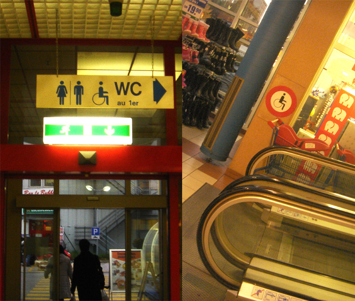 | Migros Midi-Cuendet est entièrement accessible (ascenseur et tapis roulant). Les WC adaptés, libres d'accès, se trouvent en sous-sol, au niveau de l'entrée du magasin. Pour une fois, ils sont très clairement indiqués.
