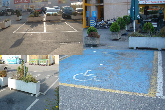 Le parking dispose de 7 places de parc pour handicapés et 7 autre pour les familles. On peut juste regretter la grande similarité de toutes ces places réservées, identiques par leur taille, leur promiscuité et par la peinture jaune qui les particularise. En face, dans un second parking destiné au bâtiment du mobilier, on trouve encore 2 places réservées.