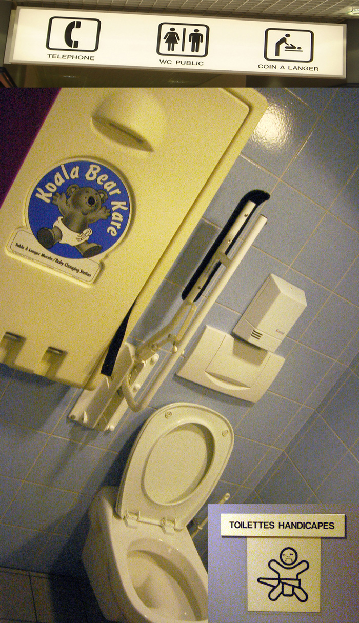 | Par contre, le WC adapté est quasi inutilisable. En effet, caché derrière un panneau très imposant, commun aux femmes et aux handicapés, ce WC est accessible par une clef qu'il faut au préalable demander au guichet.