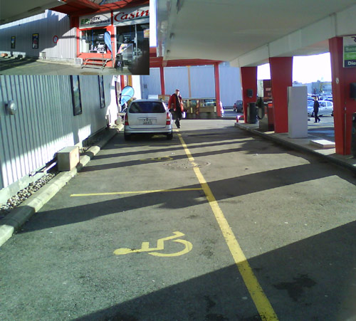 Attention : Les places réservées sont si mal situées, accolées à la station d'essence et sans surveillance, qu'elles sont utilisées par tous. De plus, il n'y a pas assez de place pour qu'une personne handicapée puisse corredctement naviguer si une voiture utilise la station! |