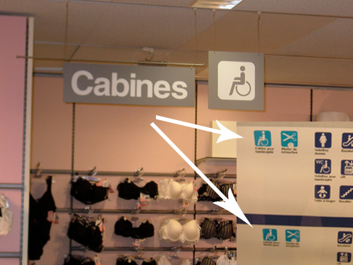 | Autre curiosité : voici un panneau indicatif bien déplacé : A l'angle d'un mur ! Traduction du panneau :"Handicapés, allez à droite" (droit au mur) = "Tapez-vous la tête contre le mur"! P.S. Pas besoin de me remercier, la traduction est gratuite. |