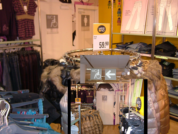 dispose de WC adaptés très clairement indiqués par de nombreux panneaux. Les WC sont situés juste à côté du restaurant. Fermés à clef, il faut s'adresser à la caisse dudit restaurant pour en obtenir l'accès. Le centre dispose encore d'un postomat abaissé et donc accessible ainsi que de cabines d'essayage adaptées. |