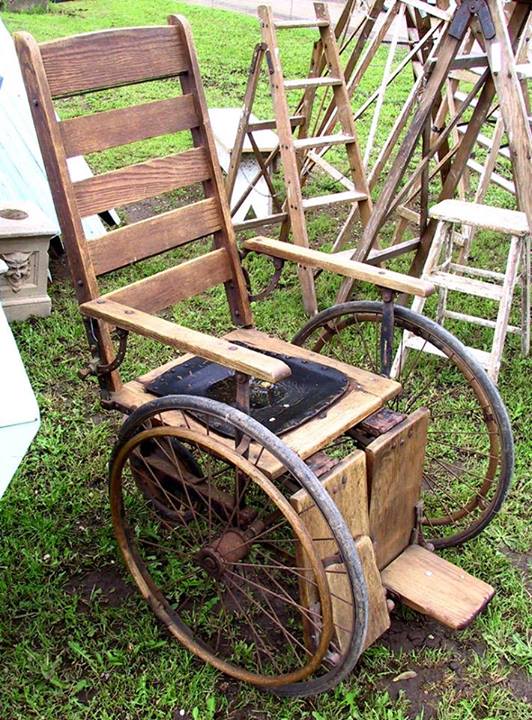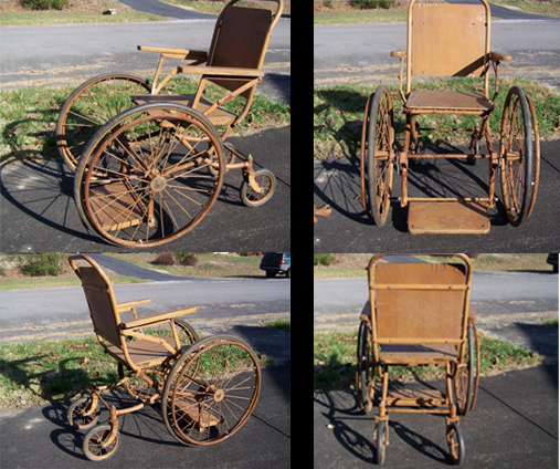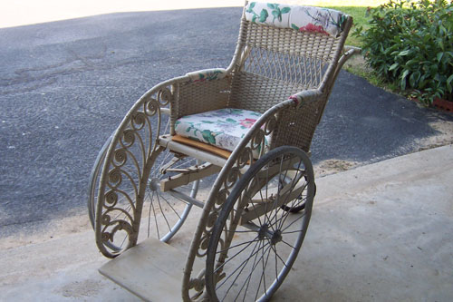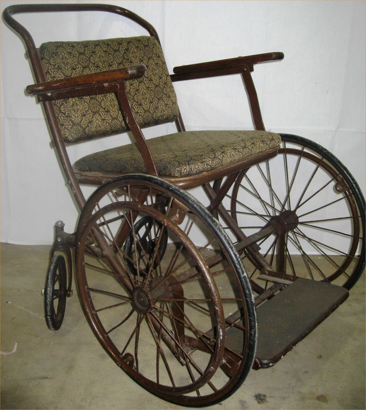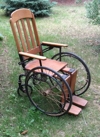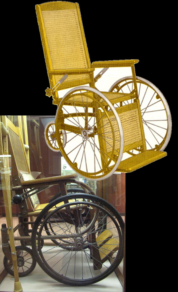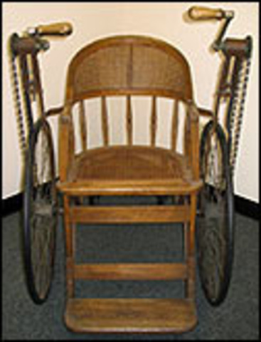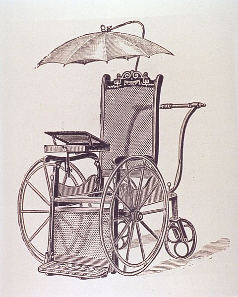 La première patente pour un fauteuil roulant a été déposé en 1869. Il s'agissant d'un chassis metallique fixe surmonté d'un siège en osier et soutenu par deux grosses roues.