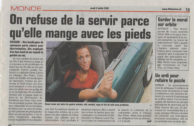 On refuse de la servir parce qu'elle mange avec... les pieds  - Chicago - Une handicapée de naissance porte plainte pour discrimination parce que des employés d'un fast food lui ont bouclé le guichet au nez. Dawn Lason, handicapée de naissance, vistime du syndrome de Holt-Oram - ses bras sont atrophiés et elle doit faire avec ses pieds tous les gestes du quotidien - raconte: "Je suis capable de rouler sur un vélo à dix vitesses, je nage, je n'ai jamais eu de problème de toute ma vie. Et cela ne m'a pas empâché d'avoir quatre enfants!" C'était jusqu'en novembre dernier quand elle s'est engagée pour la première fois dans un drive-in du Mc-Donald's de Rockford, USA. Passé le premier guichet de paiement via carte de crédit, elle a dû faire face à un refus de servir au second guichet où l'employée, dé ;goûtée, boucle le guichet et va consulter son chef. Malheureusement pour le distributeur d'aliments de masse, cette mésaventure s'est encore reproduite à plusieurs autres reprises. Mme Dawn Lason a donc ouvert une action en justice pour discrimination contre McDonald's. Le directeur de l'entreprise basé à Illinois, Larry Taylor, bien que s'abstenant de tout commentaire, dit prendre "ces allégations très au sérieux".