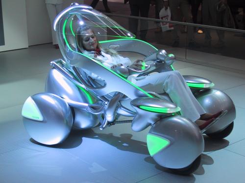 Toyota i-Unit Concept car à l'exposition universelle 2005, au Japon - Le thème était "La Sagesse de la Nature". Toyota en a fait un véhicule à une place aux allures de feuille d'arbre : i-Unit. D'un poids de tout juste 180kg et permettant une grande liberté de mouvement, écologique autant qu'individualiste, l'i-unit, entièrement fabriqué en matériaux recyclables, est mû par des moteurs électriques placé dans les roues arrière, couplé à une batterie au lithium ion. Un système de reconnaissance permet aux différents utilisateurs de faire leurs réglages personnels pendant que que la manette de conduite, à l'image d'un joystick, permet d'indiquer la direction et contr�ler la vitesse en mode manuel. Car à vitesse soutenue, l'i-unit passe du mode vertical au mode horizontal pour une meilleure tenue de route et ça se comprend, non ?