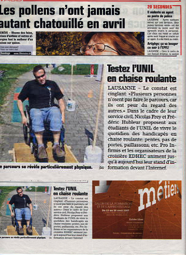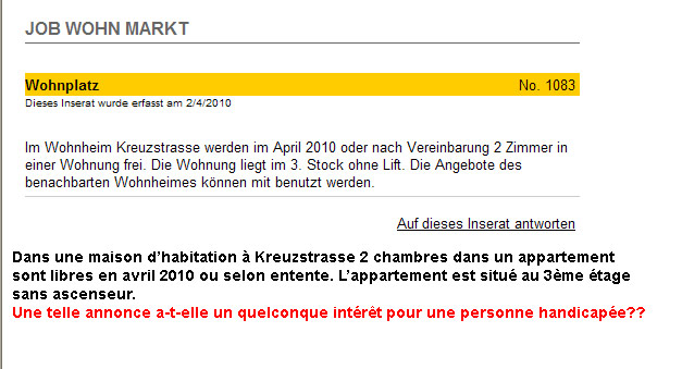 À deux ans et des poussières du délai légal pour la pleine accessibilité des commerces, bâtiments et transports publics, à savoir 2014, la situation est tellement honteuse dans notre pays que même la très consensuelle revue de la Fondation Suisse pour paraplégiques, dont le rédacteur en chef n'est autre que le plusieurs fois champion olympique Heinz Frei, vient de rédiger une protestation dans son numéro de septembre 2011. Certes, c'est avec diplomatie que les choses sont dites mais avec un titre tel que «Dépasser la mesquinerie» le propos reste clair: «Les personnes atteintes d'un handicap doivent et veulent participer à la vie sociale. Cela implique le libre accès à l'espace public et des équipements convenables. En Suisse, cependant, la voie comporte encore quelques obstacles - y compris dans la tête des professionnels de la construction.»