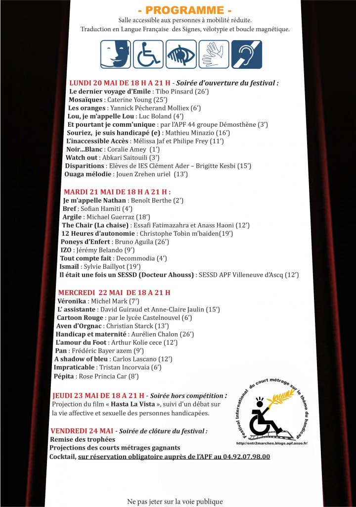 Pas non plus de soirée à thème par exemple, aucun film fait et avec des acteurs handicapés, pas de spectacle de danse handi-valide, pas de théâtre avec des acteurs handicapés, pas de match de handisport ou d'information sportive sur le handisport…