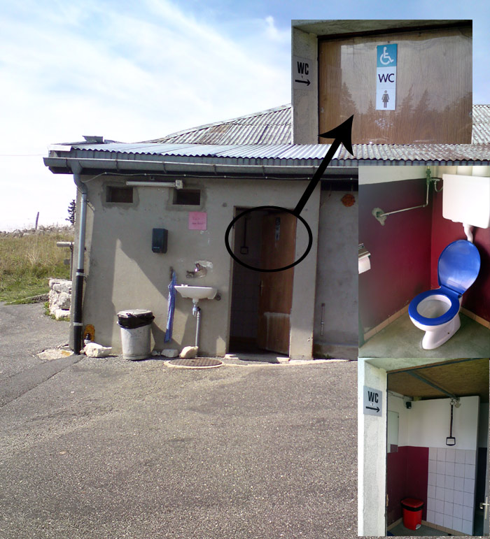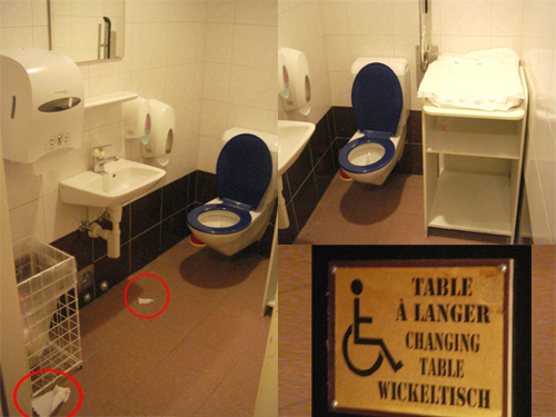 Manor (Lausanne) dispose de WC réservés (Eurokey) au dernier étage, au niveau du restaurant. Attention: les passages étroits entre les tables et une construction à double portes rendent l'accès des WC difficile!Par contre, il n'en va pas de même du restaurant Manora (Lausanne) qui lui, s'il dispose aussi de WC adapté mais non réservé en sous-sol (via monte-charge), souffre d'accessibilité et d'espace minimalistes, d'une propreté discutable ainsi qu'un défaut de signalisation.